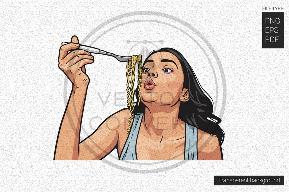 Girl having noodles with fork vector illustration